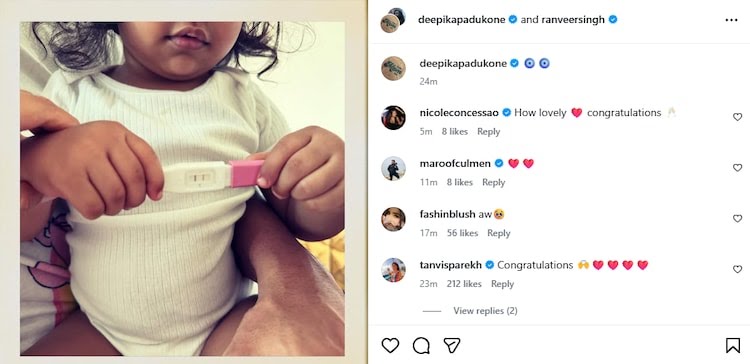 पोस्ट में उनकी बेटी दुआ को दिखाया गया है, जो अपनी मां दीपिका का पॉजिटिव प्रेग्नेंसी टेस्ट किट हाथ में थामे हुए है। इस प्यारे फोटो में दुआ रणवीर की गोद में बैठी नजर आ रही है, जो परिवार के बढ़ते खुशहाल पल को और खास बना रहा है।
